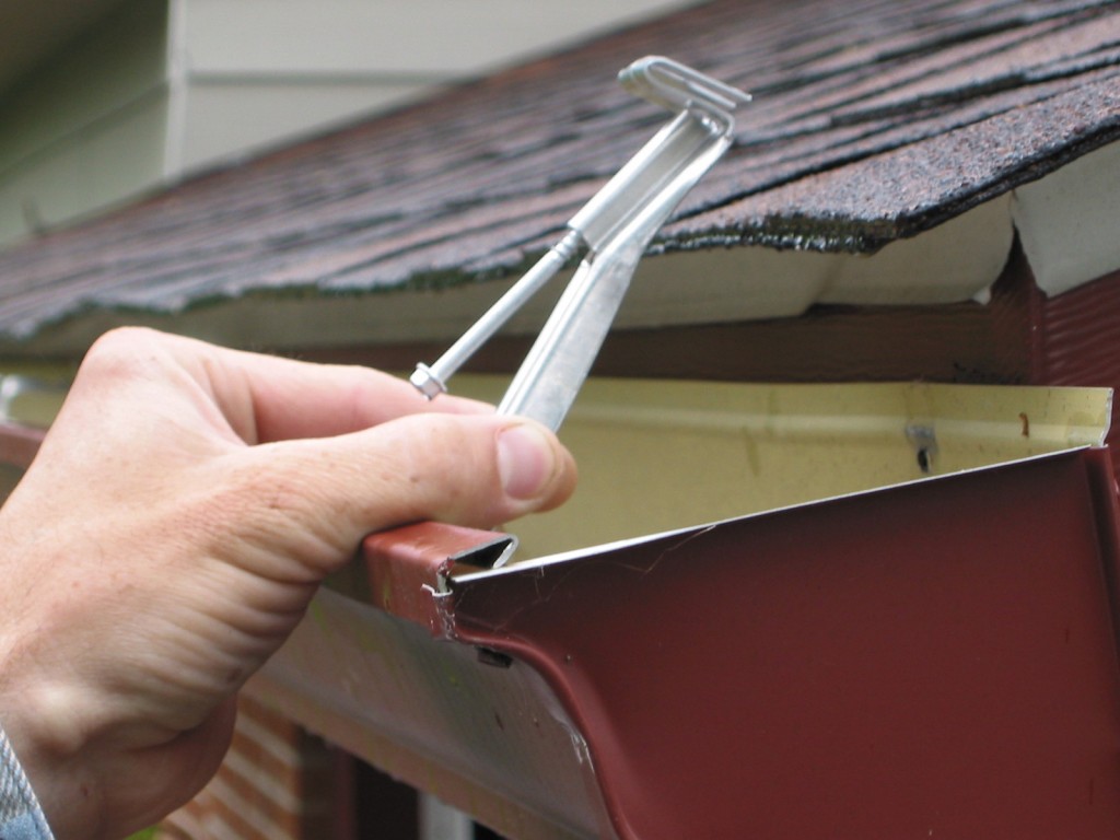 Clean Gutters: Using a ladder, work gloves and a hose, clear the gutters beginning at one end and moving to the other. Always work from the ladder and not from the roof, where you could fall off. If you find any loose gutter sections, tighten them up as you go along. It may help to have a supply of long lag bolts to use when replacing loose or missing gutter spikes. Lag bolts won’t pull out like spikes, so you usually don’t have to do this more than once. Another option would be to use a reinforced inside hidden hanger (pictured below) with screw this is the recommended option.